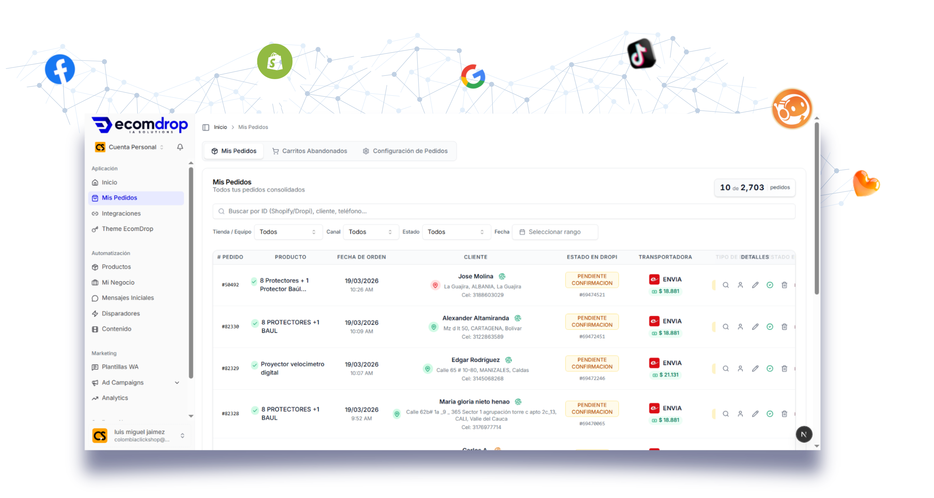 Conecta Shopify, Dropi, EcomDrop IA, TikTok, Google y Facebook. Un panel, todos tus canales de venta.